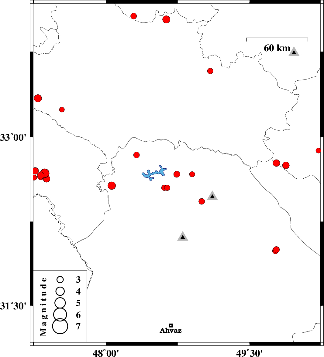 | 2012/03/22 | 06:00:19.8 | 10:30:19.8 | 32.57 | 48.06 | 43 | ML3.6 | Khoozestan Province, 30 km North-West of Andimeshk |