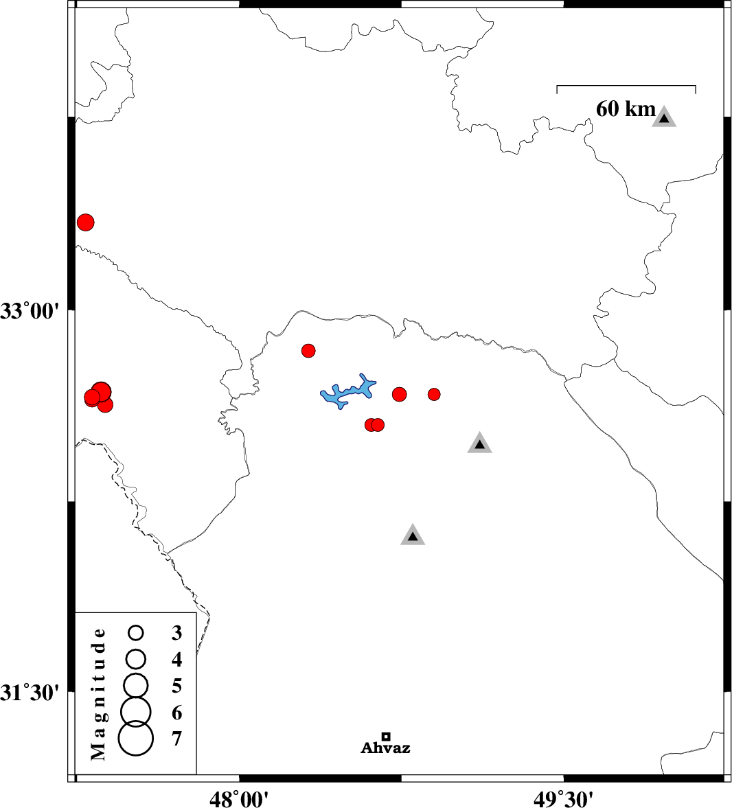 | 2012/04/18 | 05:11:53.1 | 09:41:53.1 | 32.67 | 48.9 | 15 | ML2.6 | Khoozestan Province, 37 km North-West of Lali |
