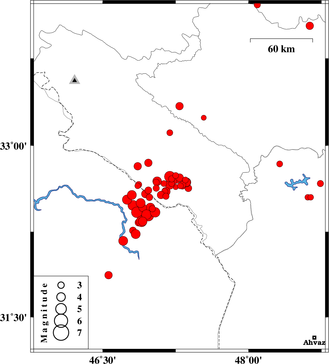| 2012/04/20 | 01:48:42.9 | 06:18:42.9 | 32.6 | 47.15 | 33 | ML4 | Ilam Province, 15 km West of Dehloran | ||