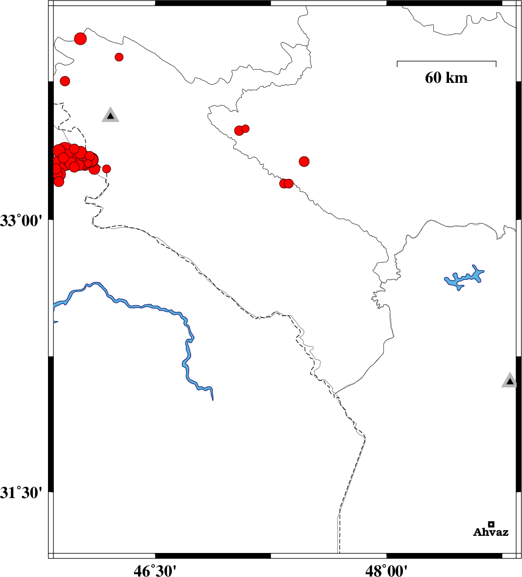 | 2012/04/25 | 20:22:55.4 | 00:52:55.4 | 32.69 | 47.18 | 14 | ML3 | Ilam Province, 8 km Dehloran | ||