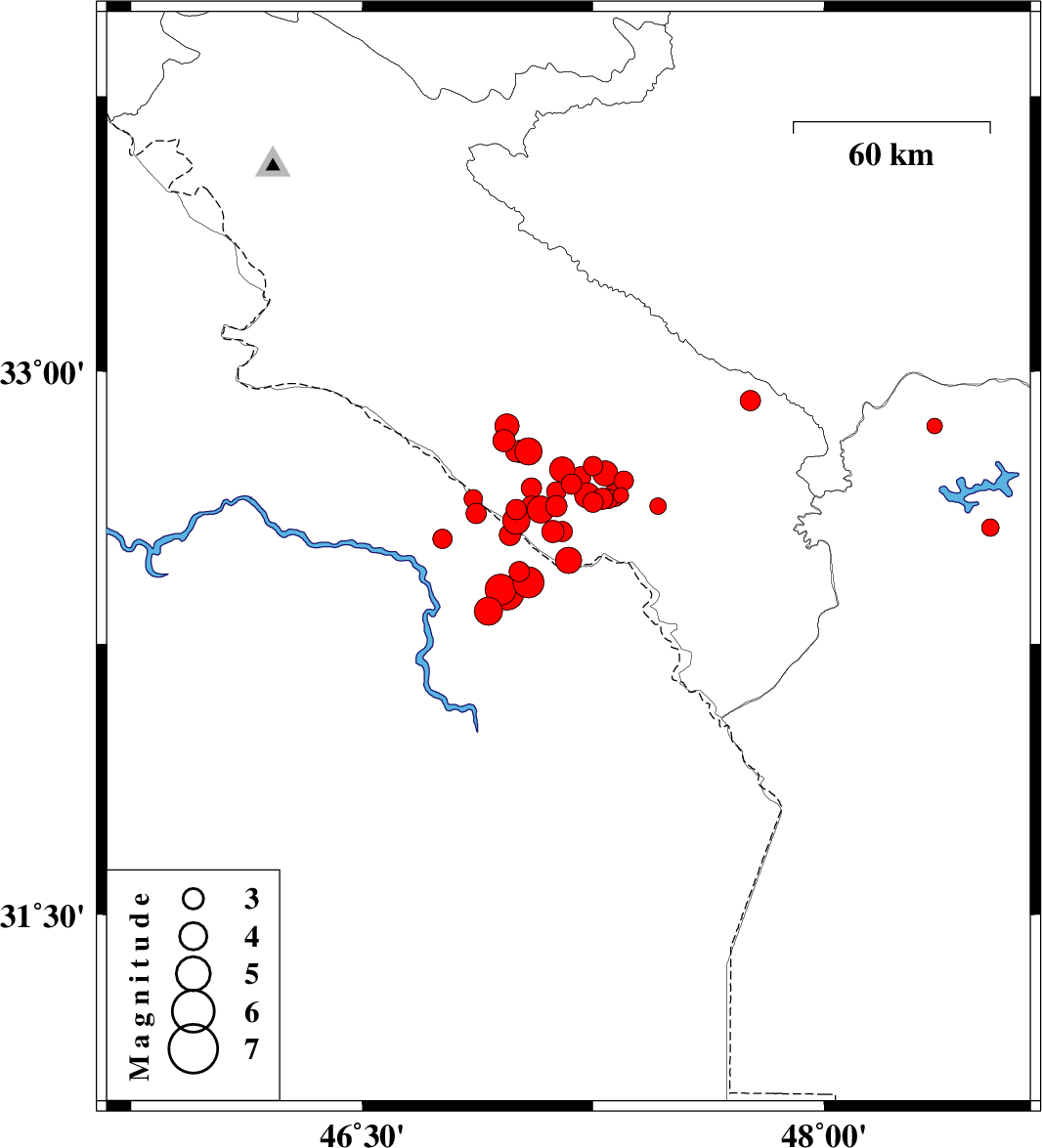 | 2012/04/23 | 15:26:28.9 | 19:56:28.9 | 32.61 | 46.87 | 14 | ML3 | Iraq, 38 km West of Dehloran | ||