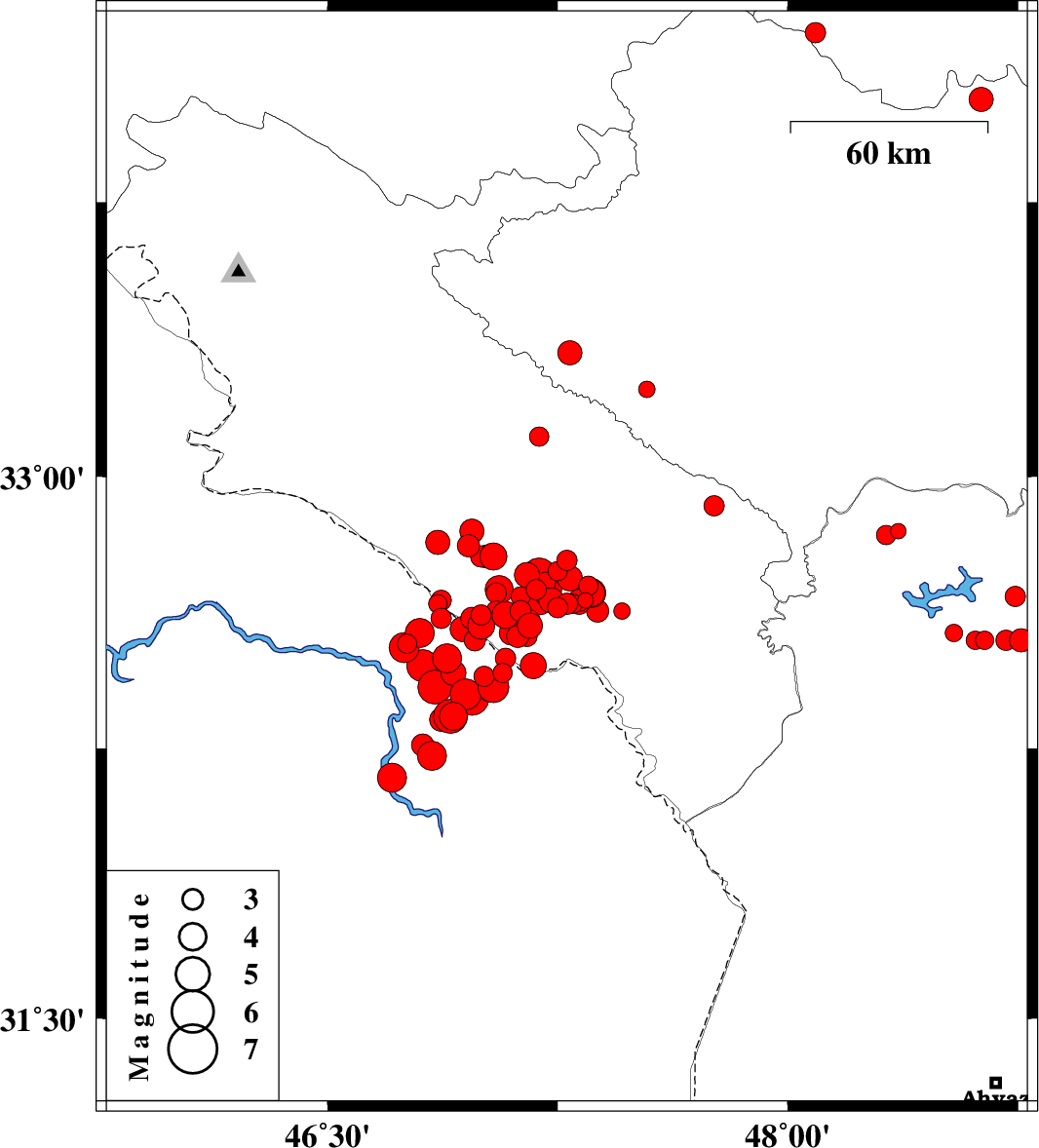 | 2012/04/20 | 01:48:42.9 | 06:18:42.9 | 32.6 | 47.15 | 33 | ML4 | Ilam Province, 15 km West of Dehloran | ||