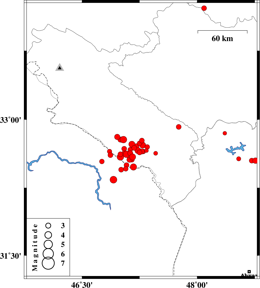 | 2012/04/25 | 20:22:55.4 | 00:52:55.4 | 32.69 | 47.18 | 14 | ML3 | Ilam Province, 8 km Dehloran | ||