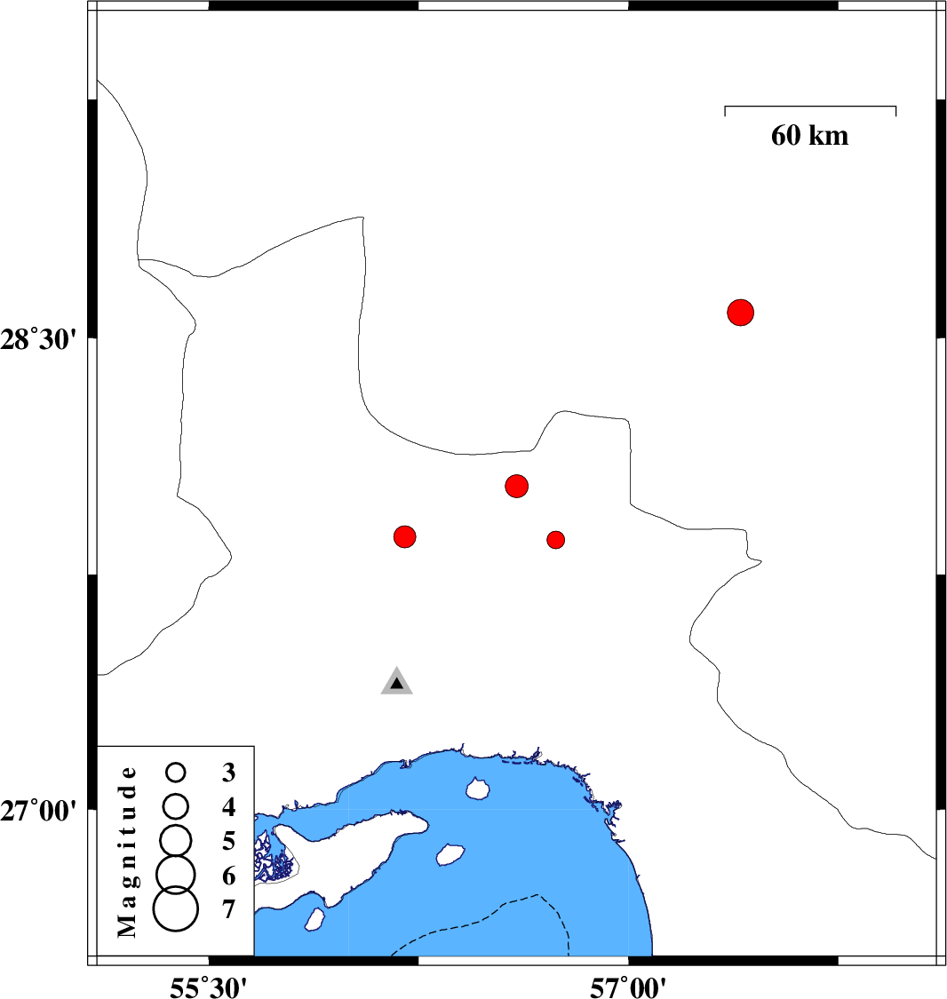 | 2012/04/29 | 11:58:38.4 | 16:28:38.4 | 28.58 | 57.4 | 31 | ML4.2 | Kerman Province, 35 km West of Jiroft |