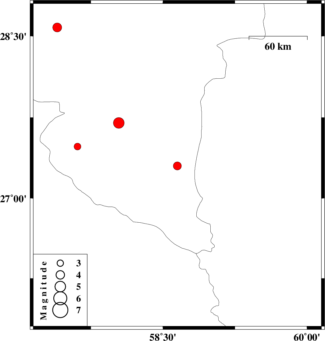 | 2012/04/29 | 11:58:38.4 | 16:28:38.4 | 28.58 | 57.4 | 31 | ML4.2 | Kerman Province, 35 km West of Jiroft | ||