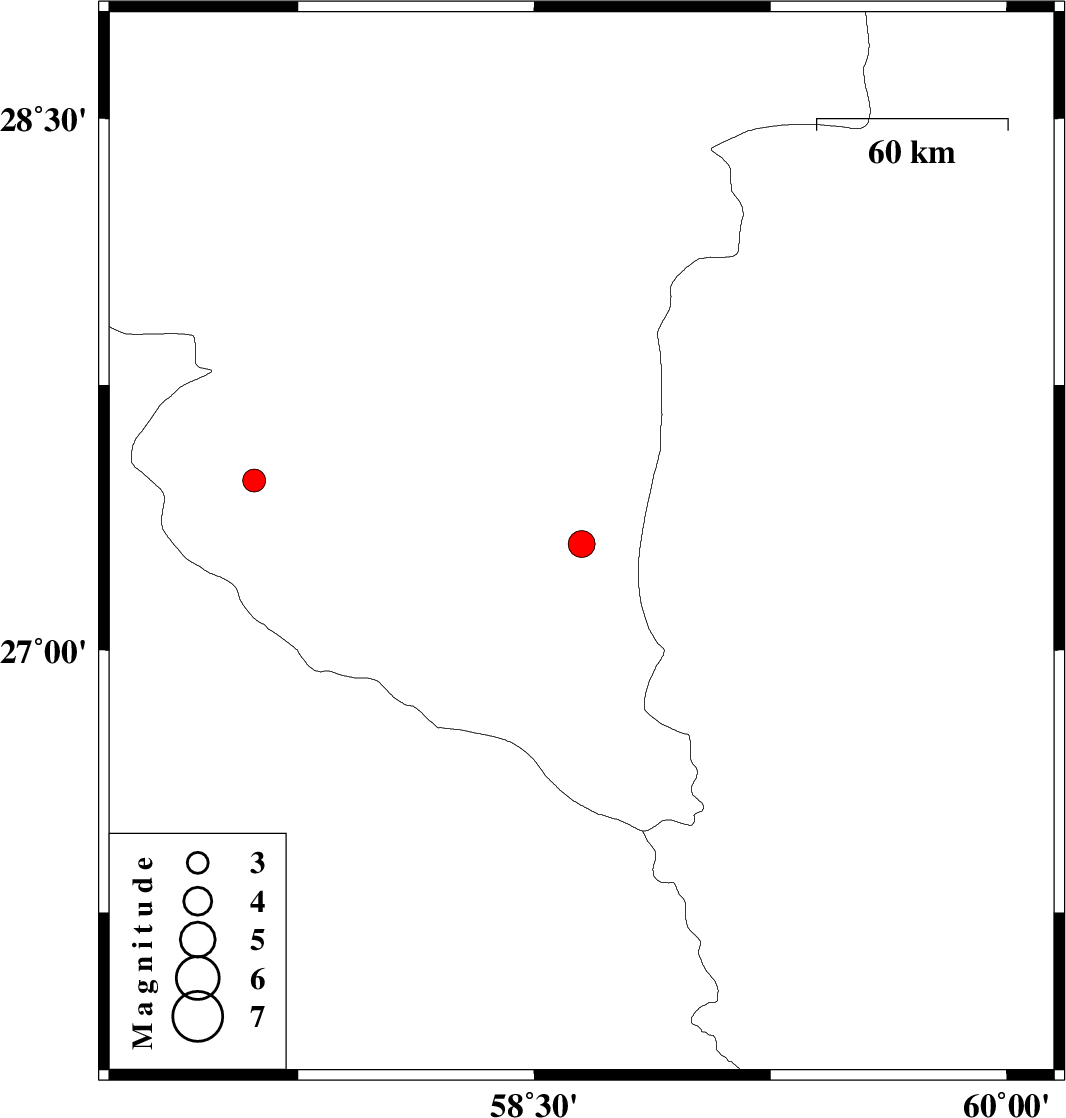 | 2012/05/07 | 00:29:11.4 | 04:59:11.4 | 27.3 | 58.65 | 15 | ML3.8 | Kerman Province, 114 km South-East of Manujan |