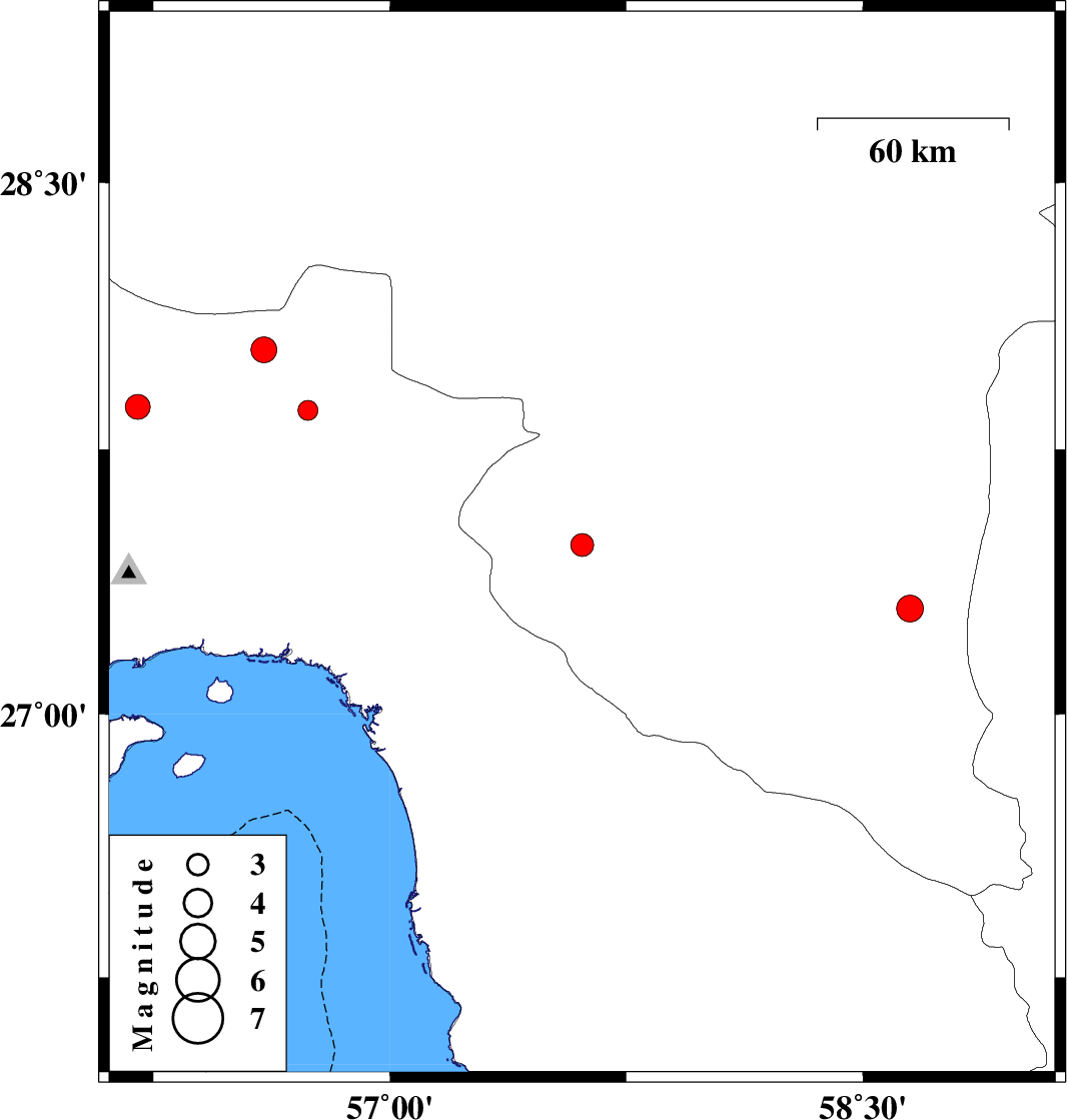 | 2012/05/07 | 17:09:31.3 | 21:39:31.3 | 27.48 | 57.61 | 14 | ML3.3 | Kerman Province, 13 km East of Manujan | ||