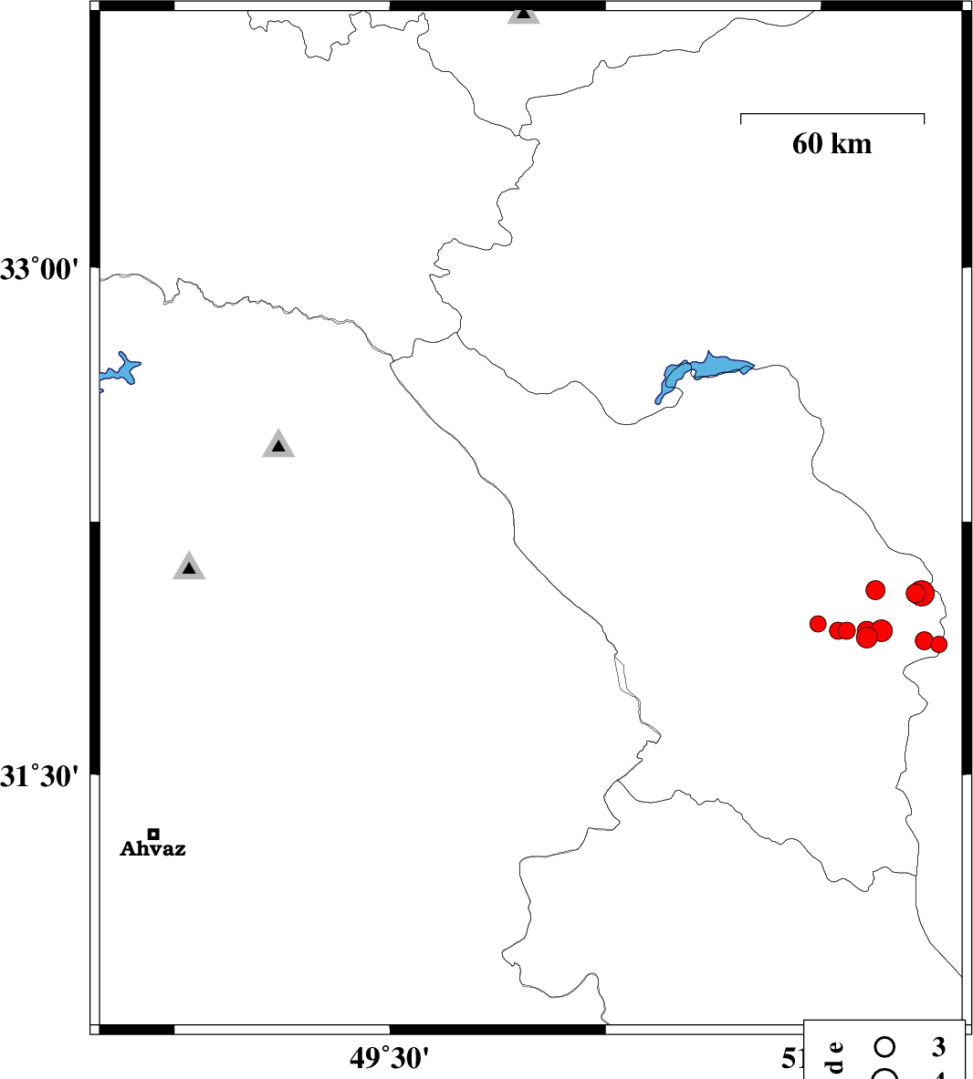| 2012/04/21 | 20:00:57.5 | 00:30:57.5 | 32.67 | 48.74 | 14 | ML3 | Khoozestan Province, 44 km North-East of Andimeshk | ||