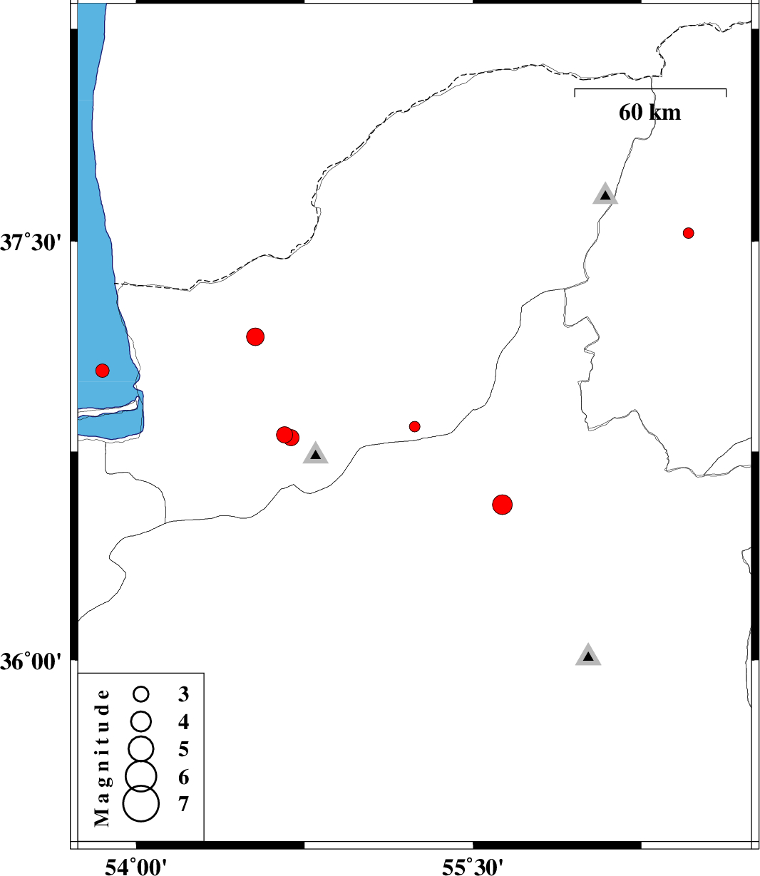 | 2012/04/29 | 12:16:11.5 | 16:46:11.5 | 36.81 | 54.66 | 14 | ML3.2 | Golestan Province, 20 km East of Gorgan | ||