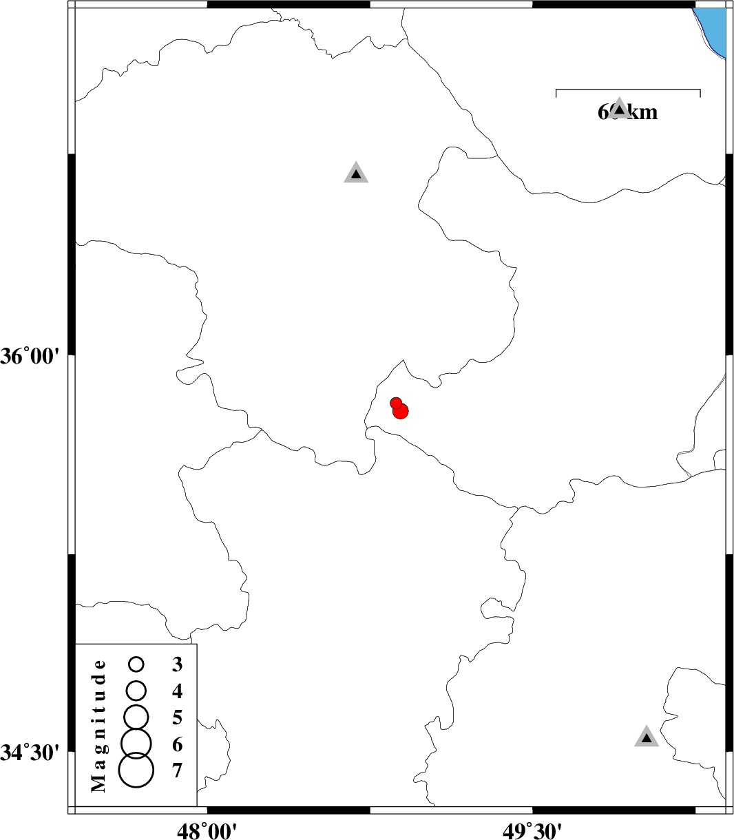 | 2012/05/11 | 13:23:56.9 | 17:53:56.9 | 35.79 | 48.89 | 14 | ML3.3 | Ghazvin Province, 48 km North-West of Razan |
