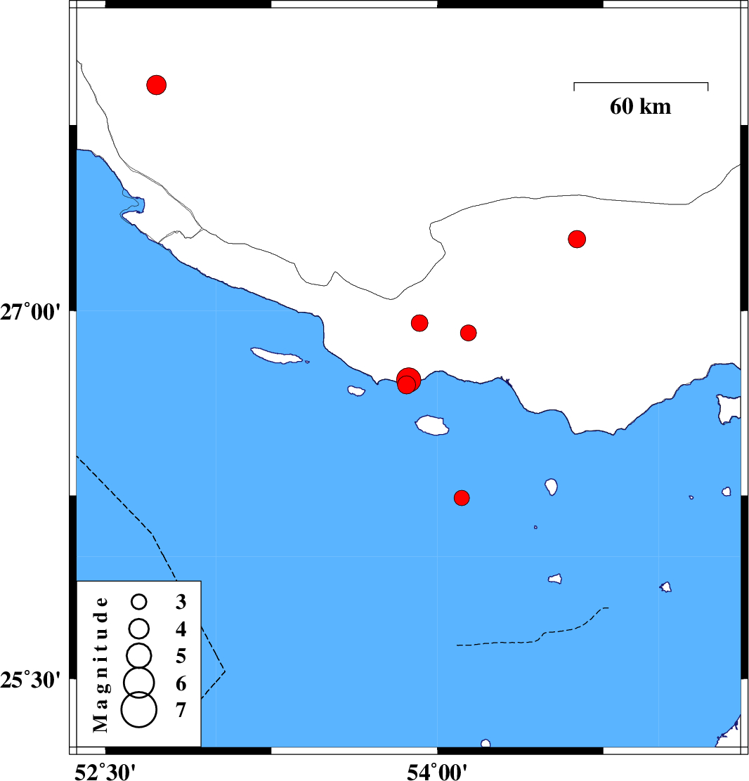 2012/05/13 18:31:17.4 23:01:17.4 26.753.8618 ML3.7 Persian Gulf, 75 km South-West of Bastak