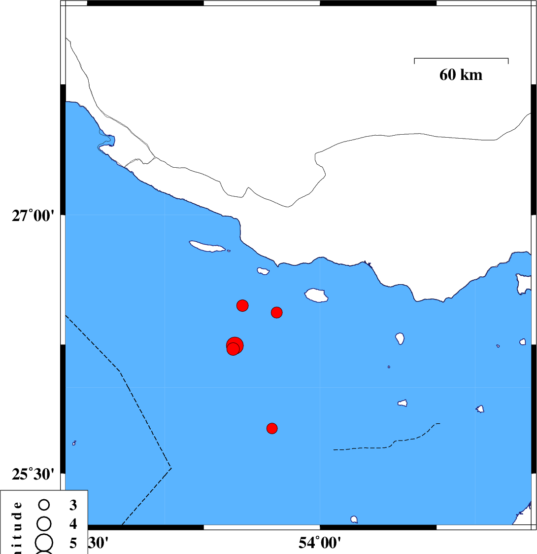 | 2012/05/11 | 06:41:25.4 | 11:11:25.4 | 26.24 | 54.11 | 15 | ML3.1 | Persian Gulf, 81 km South-West of Bandar-e lengeh |