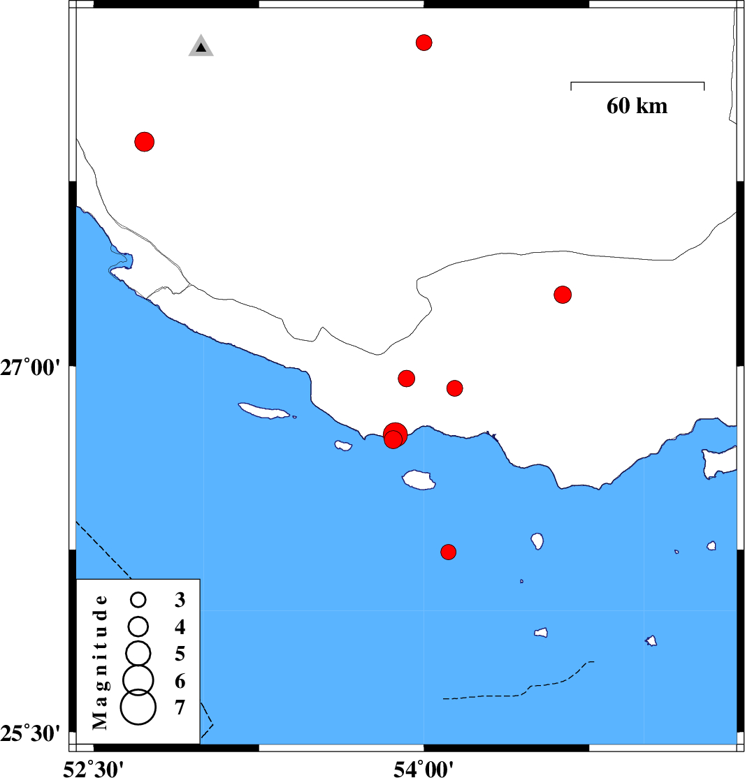| 2012/05/13 | 18:31:17.4 | 23:01:17.4 | 26.7 | 53.86 | 18 | ML3.7 | Persian Gulf, 75 km South-West of Bastak | ||