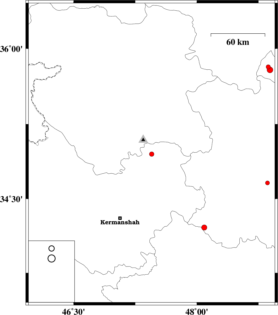 | 2012/05/14 | 13:44:49.9 | 18:14:49.9 | 34.95 | 47.45 | 16 | ML2.6 | Kermanshah Province, 23 km North-West of Sonqor | ||
