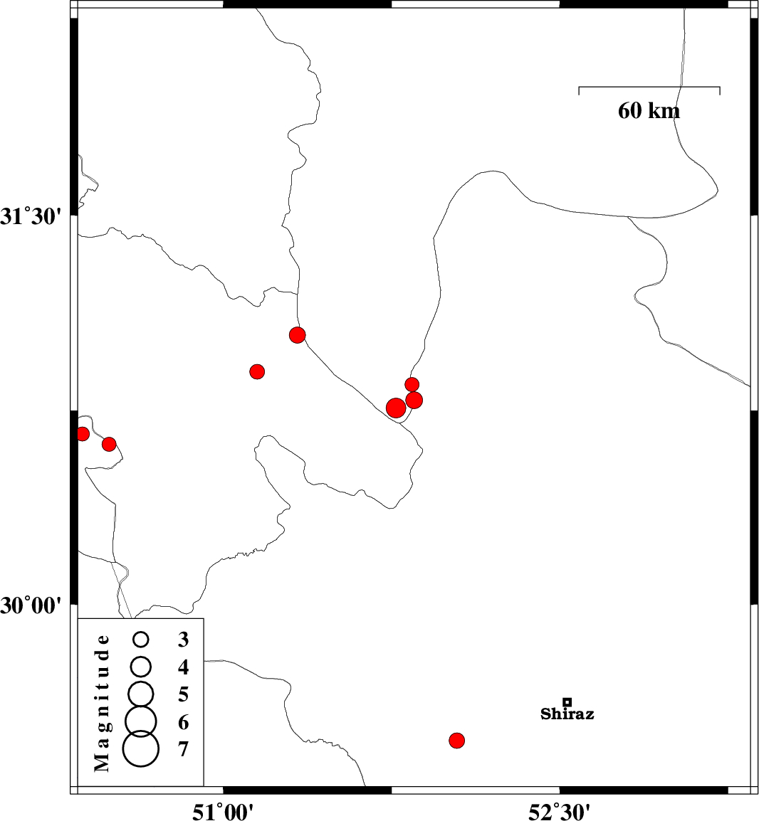| 2012/05/07 | 02:10:25.7 | 06:40:25.7 | 29.47 | 52.04 | 14 | ML3.1 | Fars Province, 41 km South-East of Kazerun | ||