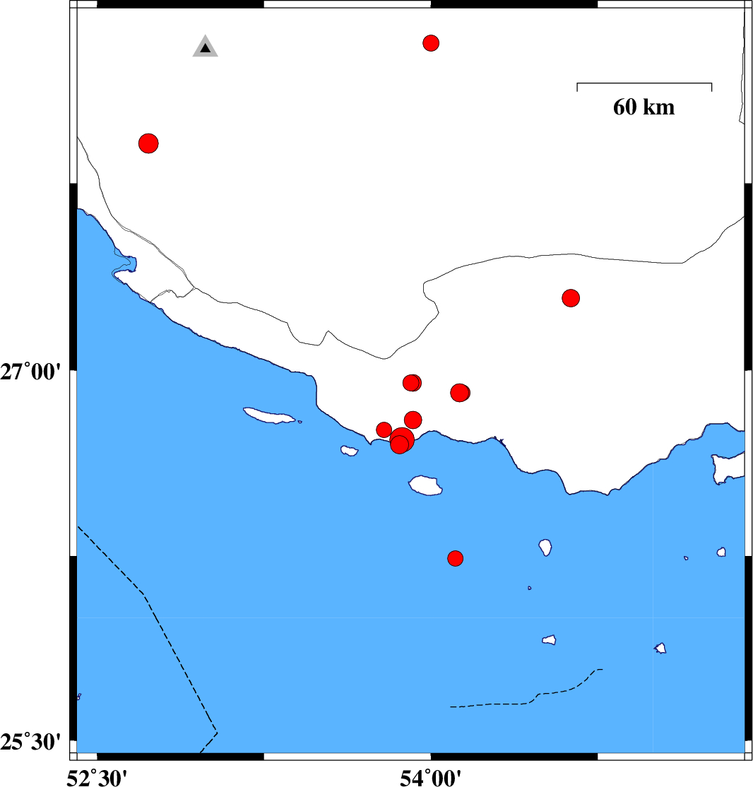 | 2012/05/13 | 18:31:17.4 | 23:01:17.4 | 26.7 | 53.86 | 18 | ML3.7 | Persian Gulf, 75 km South-West of Bastak | ||