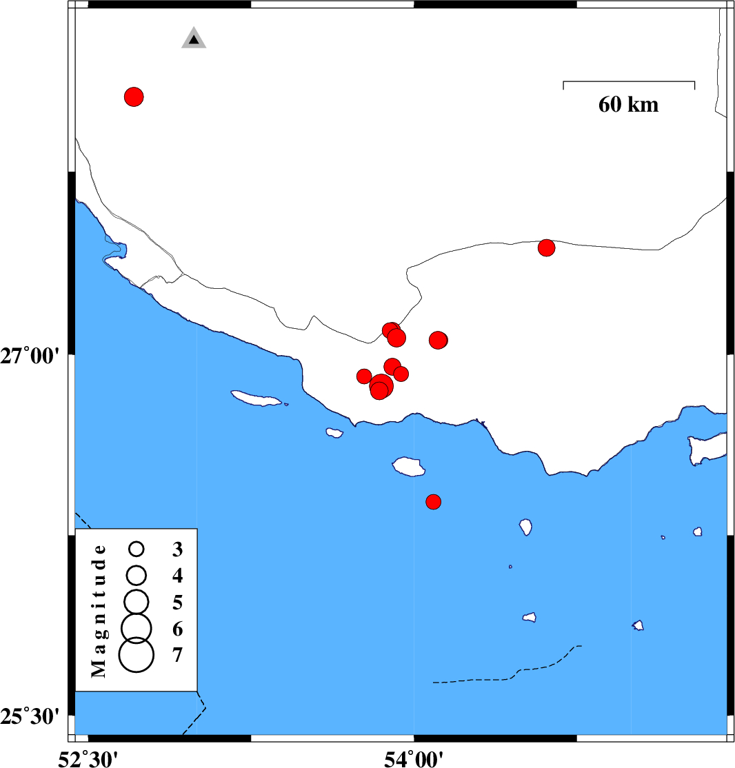 | 2012/05/13 | 18:31:17.4 | 23:01:17.4 | 26.7 | 53.86 | 18 | ML3.7 | Persian Gulf, 75 km South-West of Bastak | ||