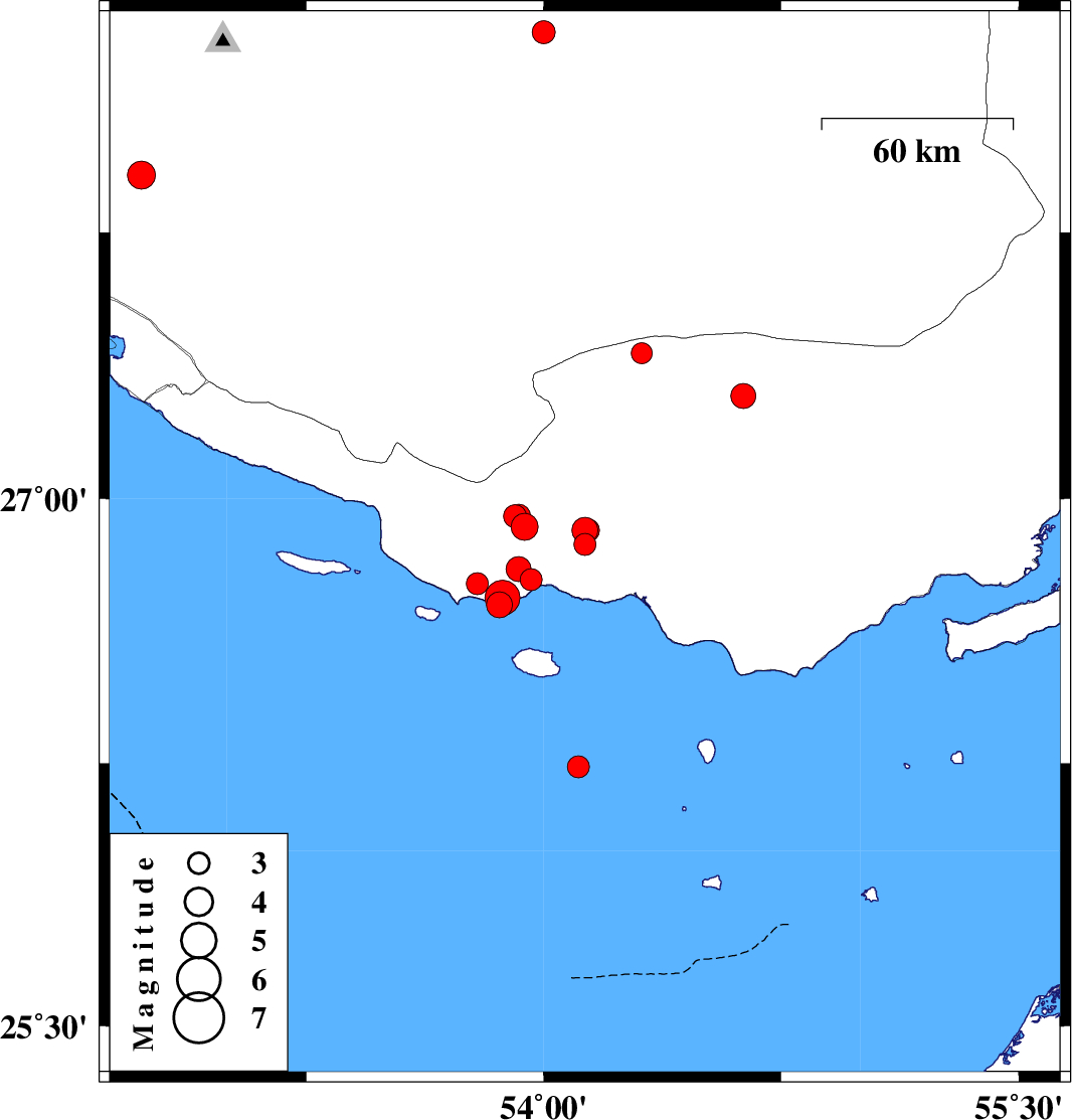 | 2012/05/13 | 18:31:17.4 | 23:01:17.4 | 26.7 | 53.86 | 18 | ML3.7 | Persian Gulf, 75 km South-West of Bastak | ||