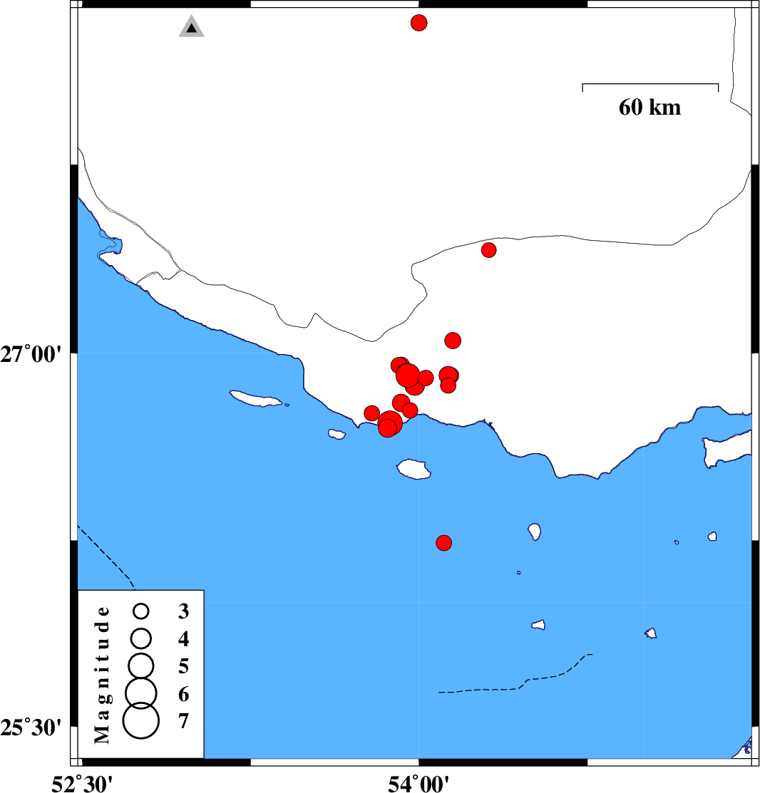 | 2012/05/11 | 06:41:25.4 | 11:11:25.4 | 26.24 | 54.11 | 15 | ML3.1 | Persian Gulf, 81 km South-West of Bandar-e lengeh |
