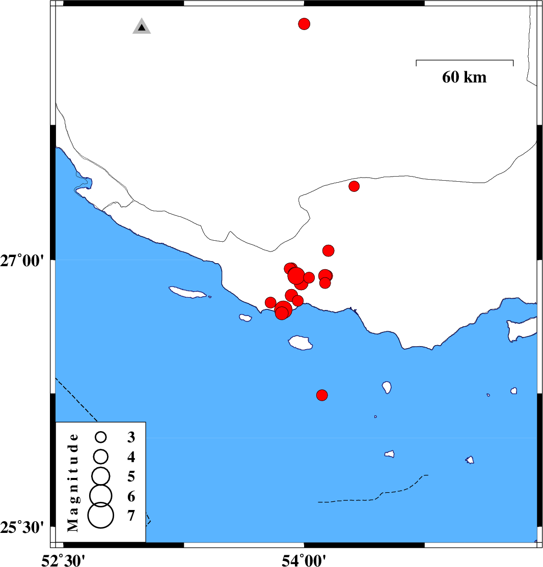 | 2012/05/11 | 06:41:25.4 | 11:11:25.4 | 26.24 | 54.11 | 15 | ML3.1 | Persian Gulf, 81 km South-West of Bandar-e lengeh |