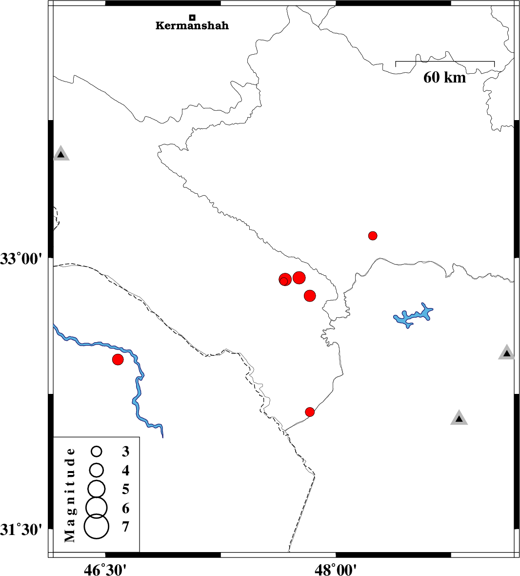 | 2012/05/13 | 19:28:02.4 | 23:58:02.4 | 32.88 | 47.67 | 14 | ML3.6 | Ilam Province, 20 km East of Abdanan | ||