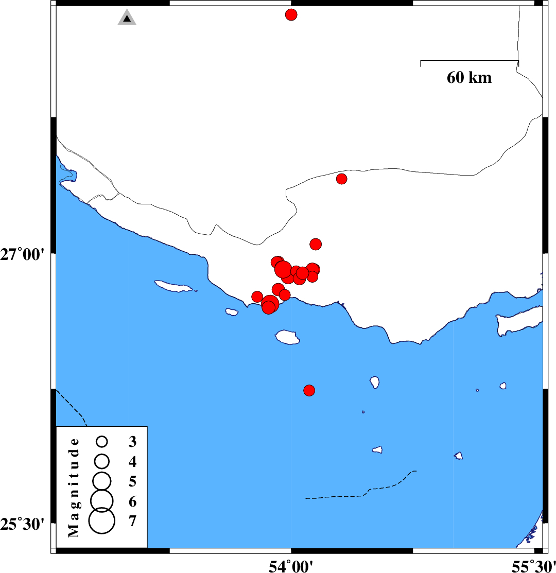 | 2012/05/13 | 18:31:17.4 | 23:01:17.4 | 26.7 | 53.86 | 18 | ML3.7 | Persian Gulf, 75 km South-West of Bastak | ||
