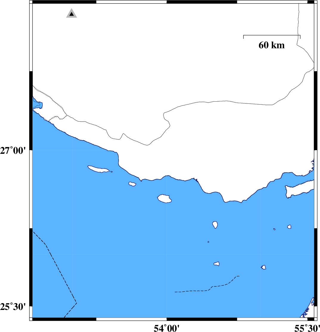 | 2012/05/11 | 06:41:25.4 | 11:11:25.4 | 26.24 | 54.11 | 15 | ML3.1 | Persian Gulf, 81 km South-West of Bandar-e lengeh |