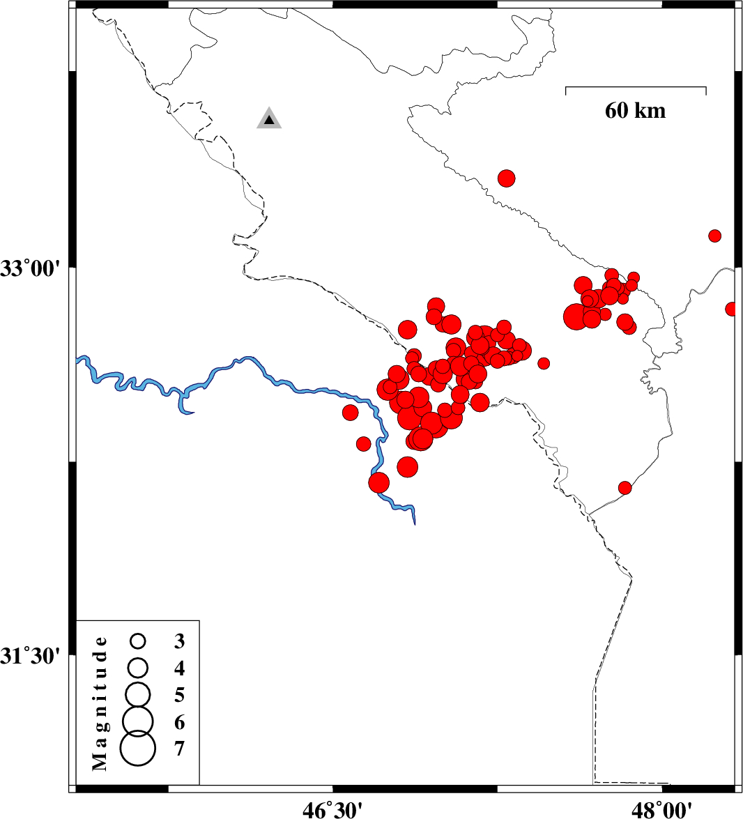 | 2012/05/03 | 10:09:37.3 | 14:39:37.3 | 32.81 | 47.61 | 14 | ML5.4 | Ilam Province, 19 km South-East of Abdanan | ||