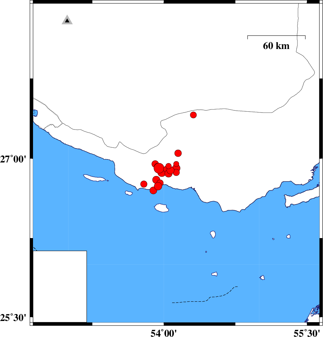 | 2012/05/19 | 12:54:15.7 | 17:24:15.7 | 26.7 | 53.89 | 38 | ML3.4 | Persian Gulf, 73 km South-West of Bastak | ||