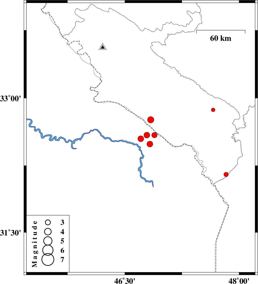 | 2012/05/19 | 17:02:42.5 | 21:32:42.5 | 32.59 | 46.79 | 14 | ML3.5 | Iraq, 45 km South-West of Dehloran | ||