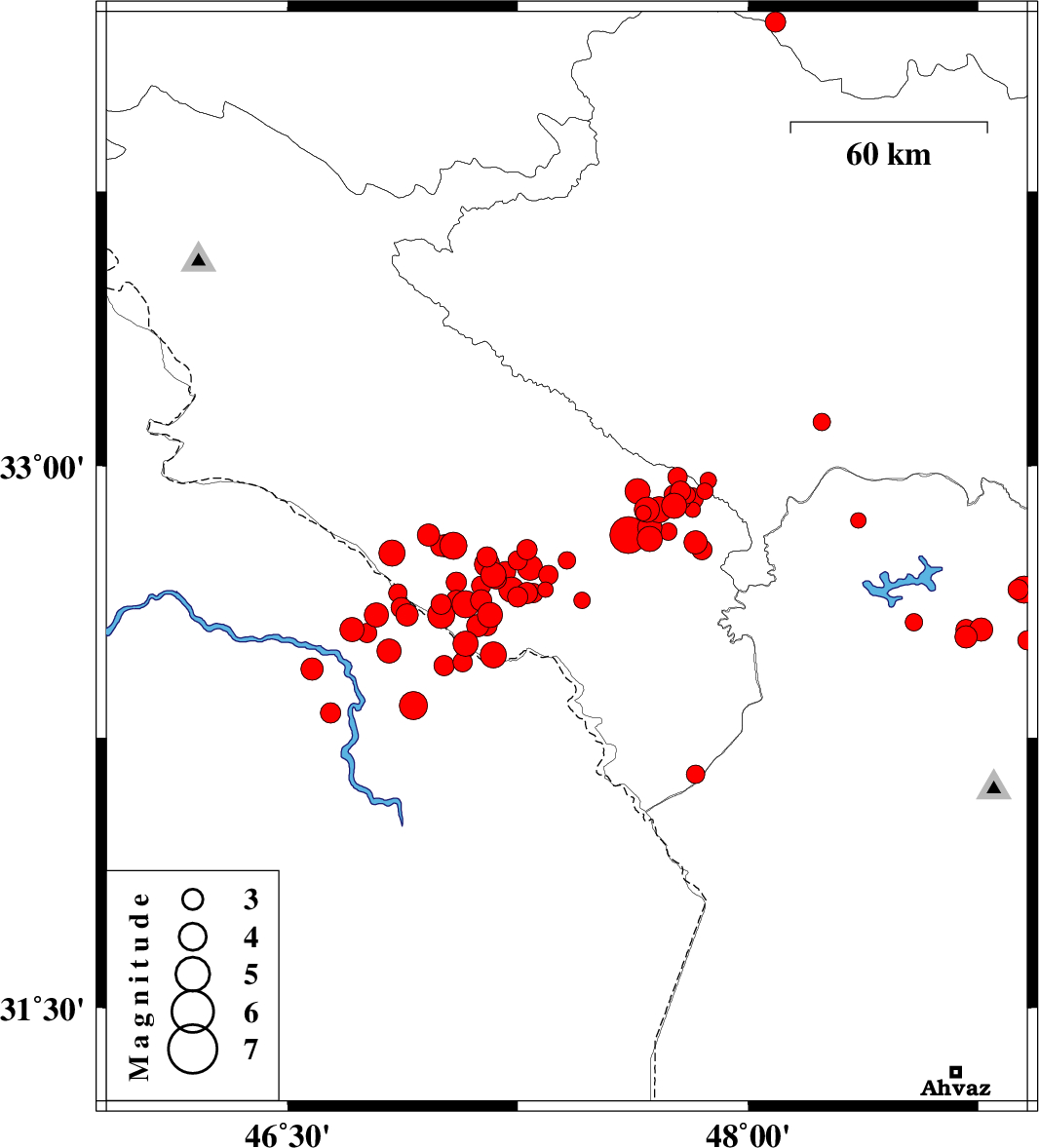 | 2012/05/03 | 11:12:54.3 | 15:42:54.3 | 32.93 | 47.64 | 14 | ML3.6 | Ilam Province, 16 km East of Abdanan | ||