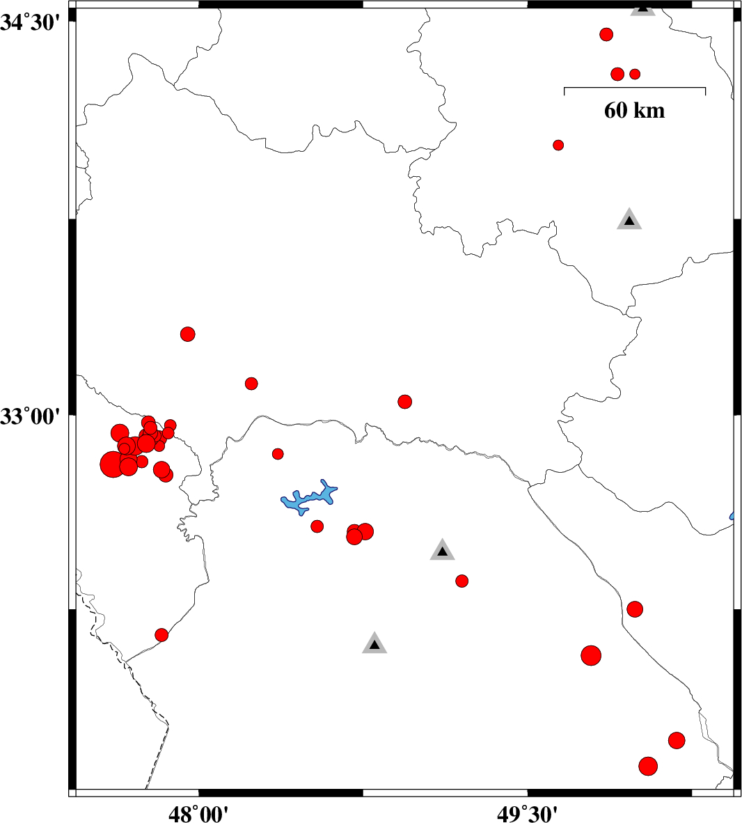 | 2012/05/03 | 11:12:54.3 | 15:42:54.3 | 32.93 | 47.64 | 14 | ML3.6 | Ilam Province, 16 km East of Abdanan | ||