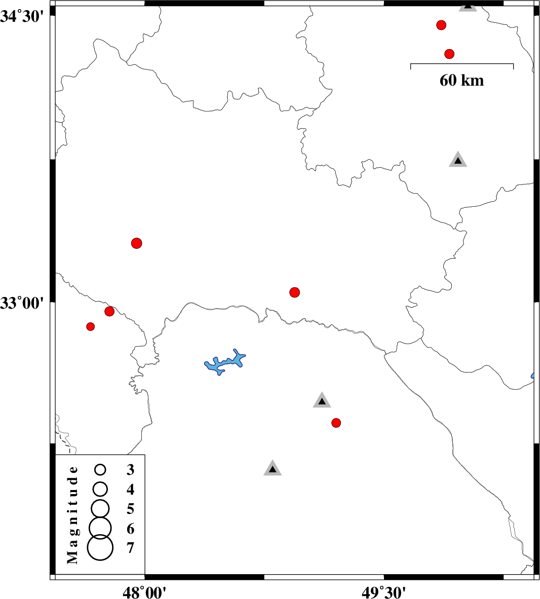 | 2012/05/25 | 12:27:46.3 | 16:57:46.3 | 33.05 | 48.94 | 14 | ML2.8 | Lorestan Province, 49 km South-West of Dorud | ||