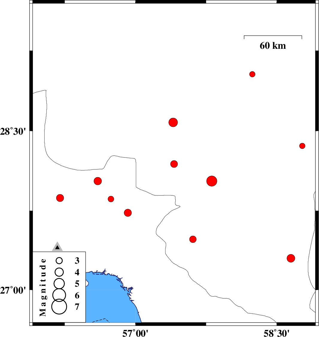 | 2012/04/29 | 11:58:38.4 | 16:28:38.4 | 28.58 | 57.4 | 31 | ML4.2 | Kerman Province, 35 km West of Jiroft |