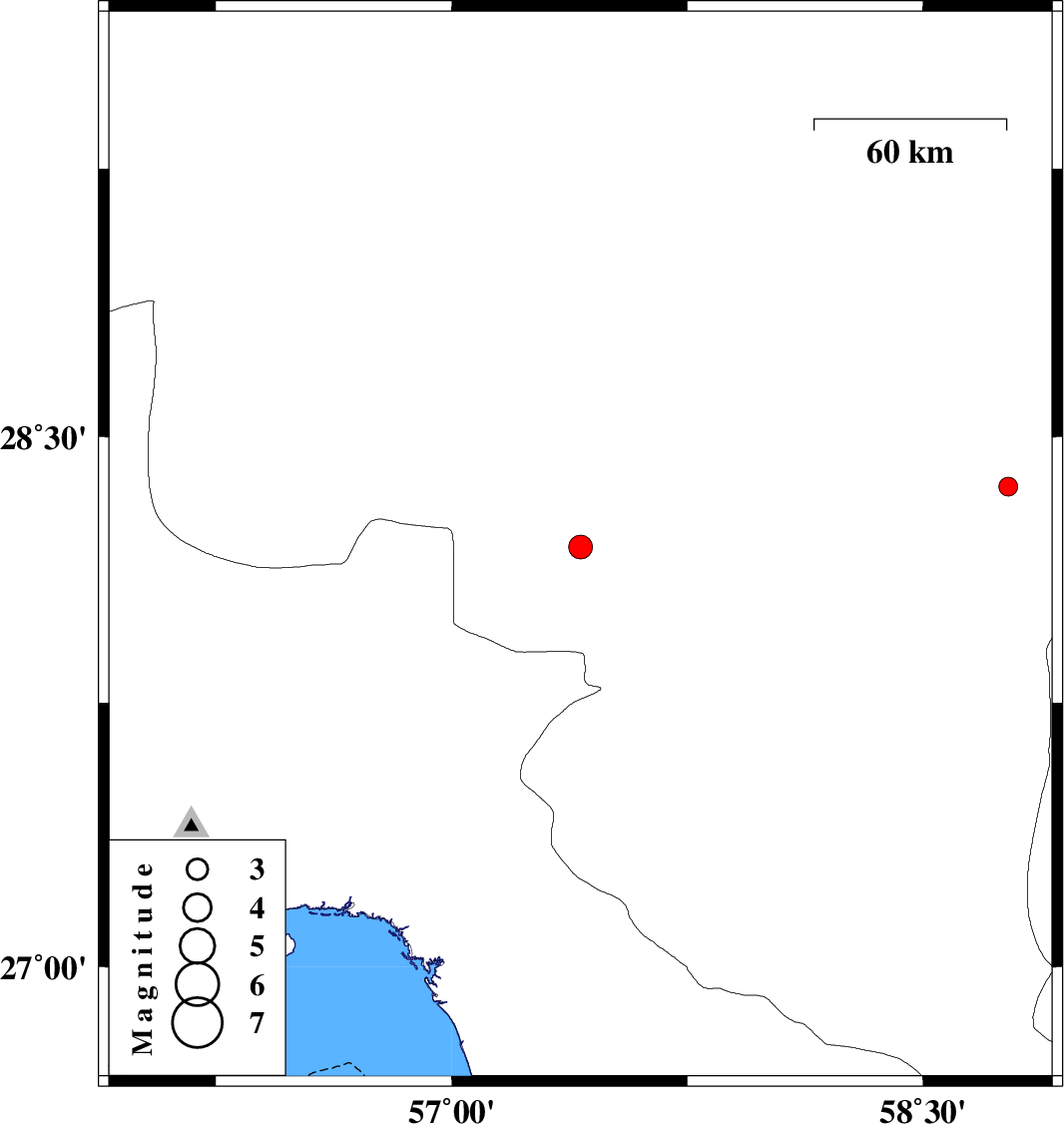 | 2012/05/28 | 10:12:01.8 | 14:42:01.8 | 28.36 | 58.77 | 14 | ML2.7 | Kerman Province, 92 km South-East of Bam |