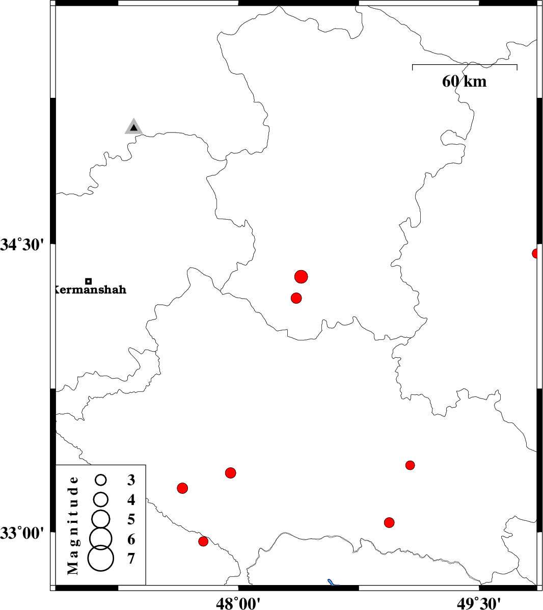 | 2012/05/23 | 04:03:47.5 | 08:33:47.5 | 32.95 | 47.78 | 15 | ML2.7 | Ilam Province, 23 km South of Pol-e dokhtar |