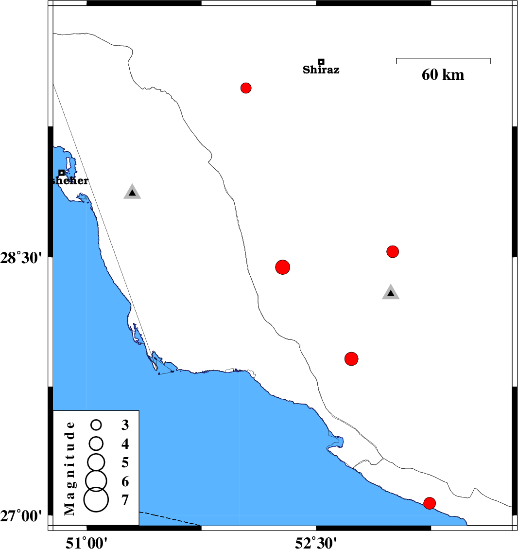 | 2012/04/30 | 11:53:03.3 | 16:23:03.3 | 27.91 | 52.73 | 14 | ML3.9 | Fars Province, 42 km East of Jam |