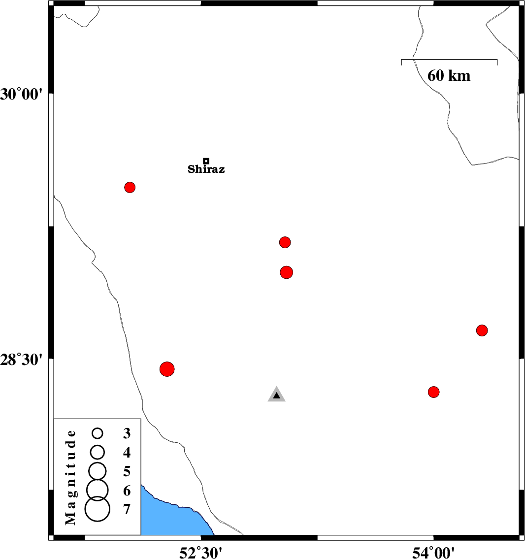 | 2012/05/07 | 02:10:25.7 | 06:40:25.7 | 29.47 | 52.04 | 14 | ML3.1 | Fars Province, 41 km South-East of Kazerun | ||