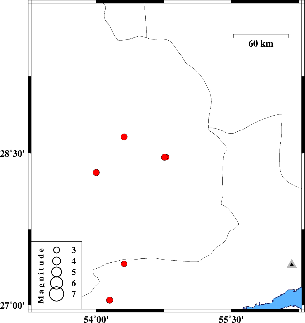 | 2012/05/12 | 01:18:00.1 | 05:48:00.1 | 28.31 | 54 | 45 | ML3.2 | Fars Province, 48 km South-East of Jahrom | ||