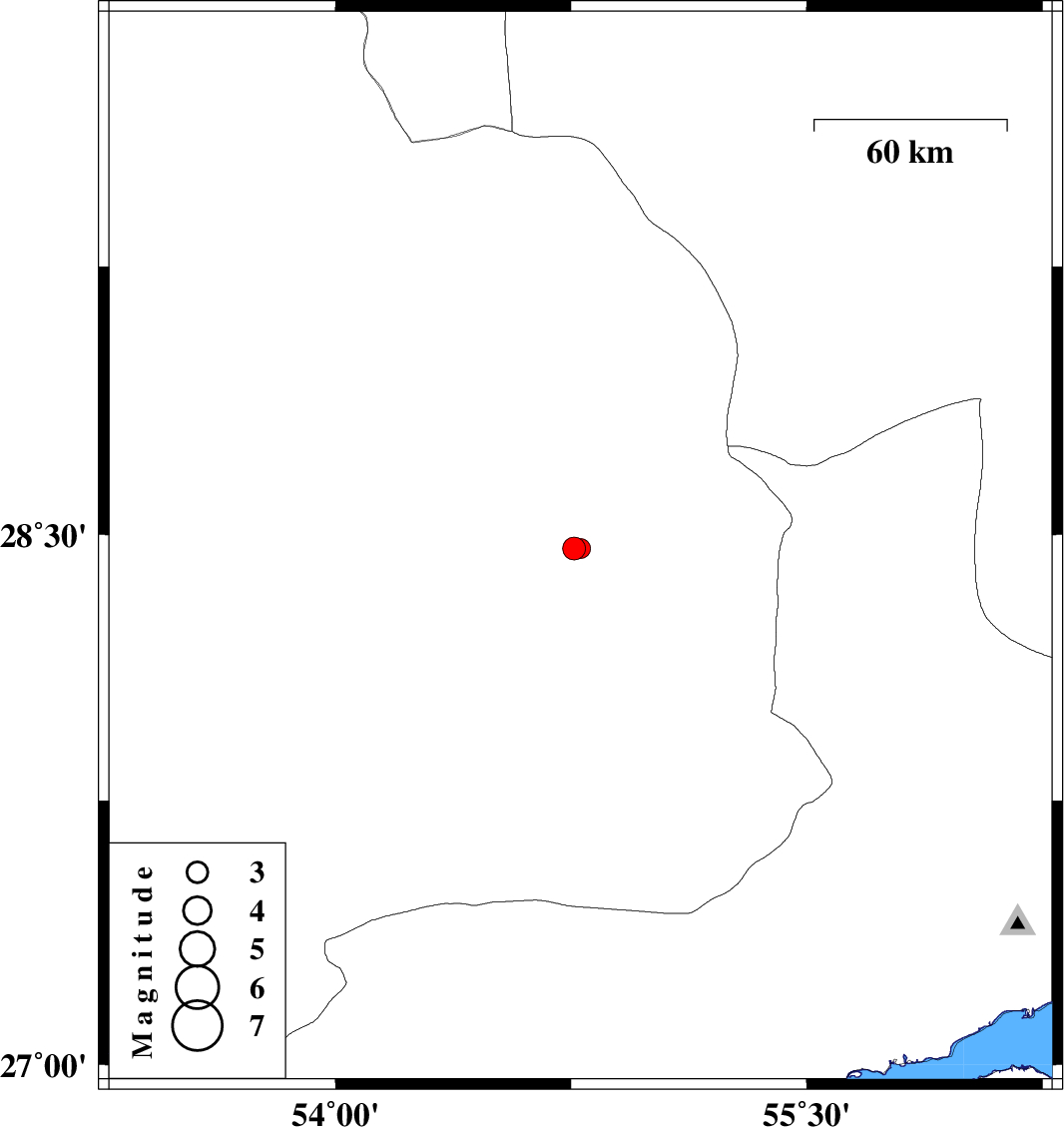 | 2012/06/02 | 13:40:50.4 | 18:10:50.4 | 28.46 | 54.78 | 18 | ML2.8 | Fars Province, 40 km South-East of Darab |