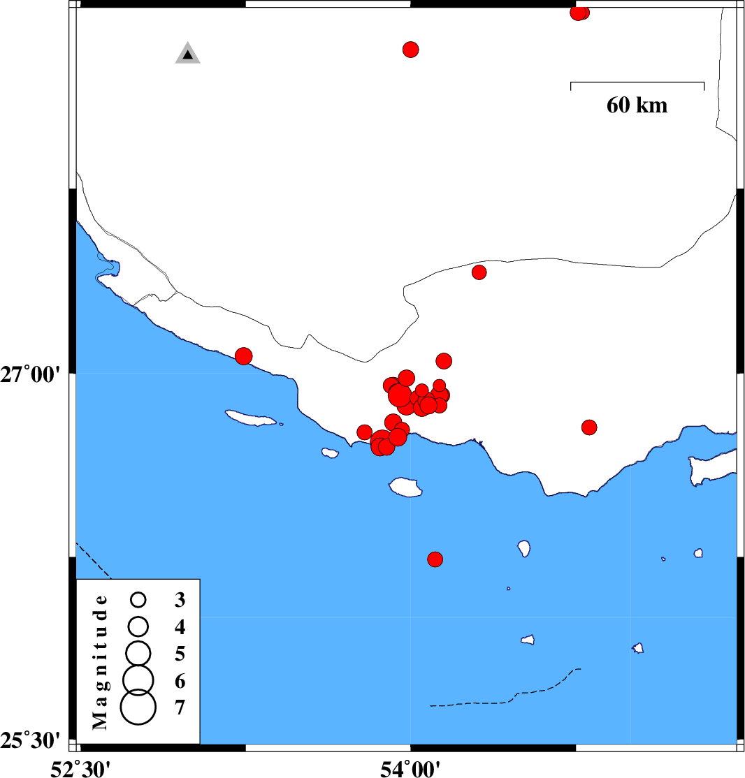| 2012/05/17 | 19:32:11.5 | 00:02:11.5 | 26.87 | 53.98 | 33 | ML4 | Hormozgan Province, 53 km South-West of Bastak | ||