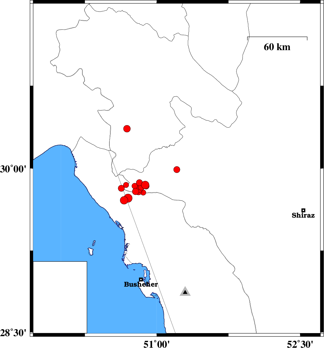 | 2012/06/06 | 20:02:41.2 | 00:32:41.2 | 29.71 | 50.66 | 46 | ML3.6 | Bushehr Province, 21 km North-East of Bandar-e genaveh | ||