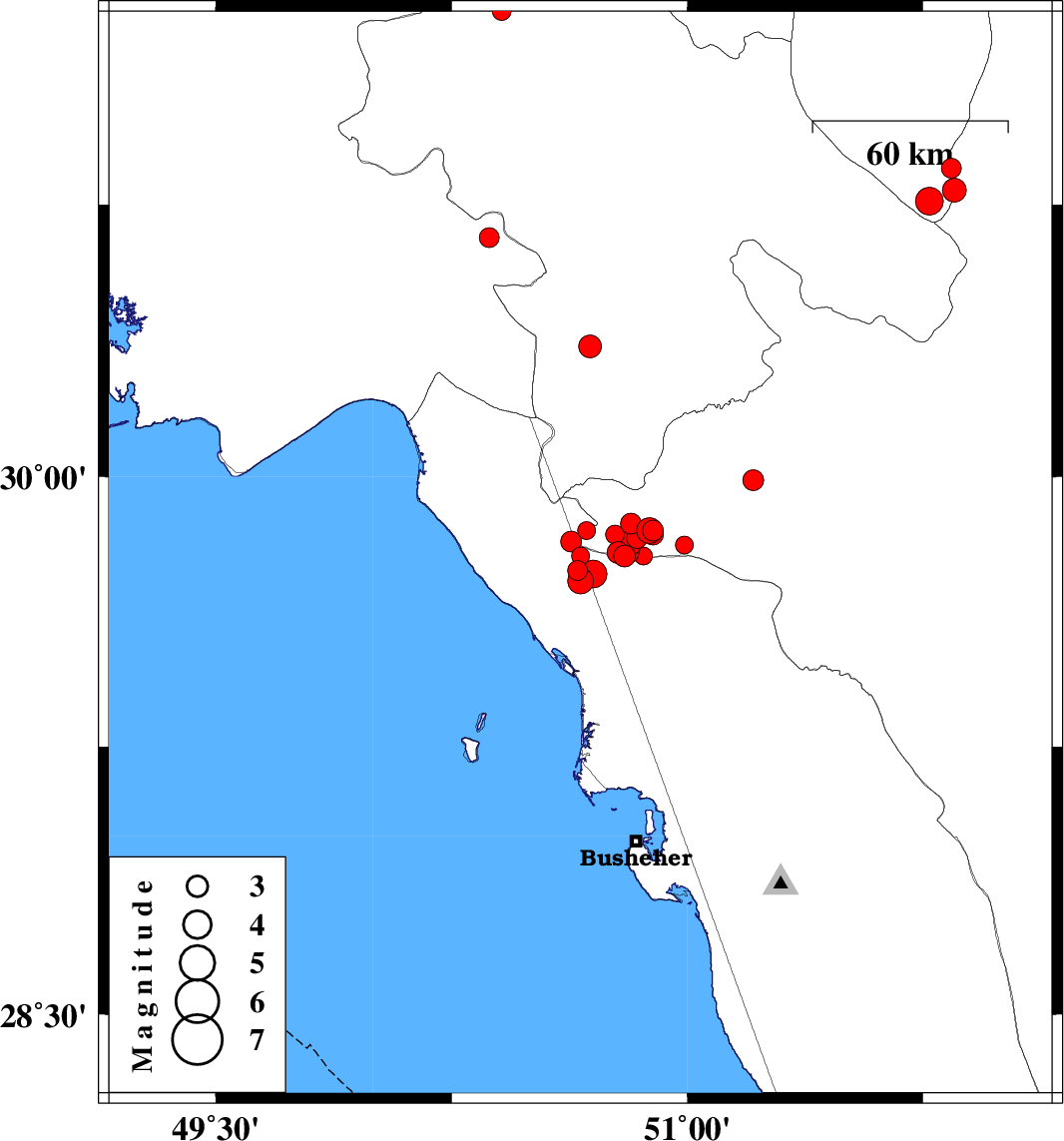 | 2012/06/04 | 19:04:19.9 | 23:34:19.9 | 29.82 | 50.63 | 46 | ML2.9 | Bushehr Province, 29 km North-East of Bandar-e genaveh | ||