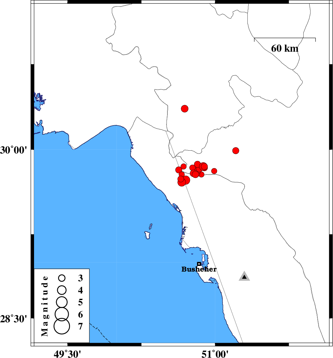 | 2012/06/04 | 19:04:19.9 | 23:34:19.9 | 29.82 | 50.63 | 46 | ML2.9 | Bushehr Province, 29 km North-East of Bandar-e genaveh | ||