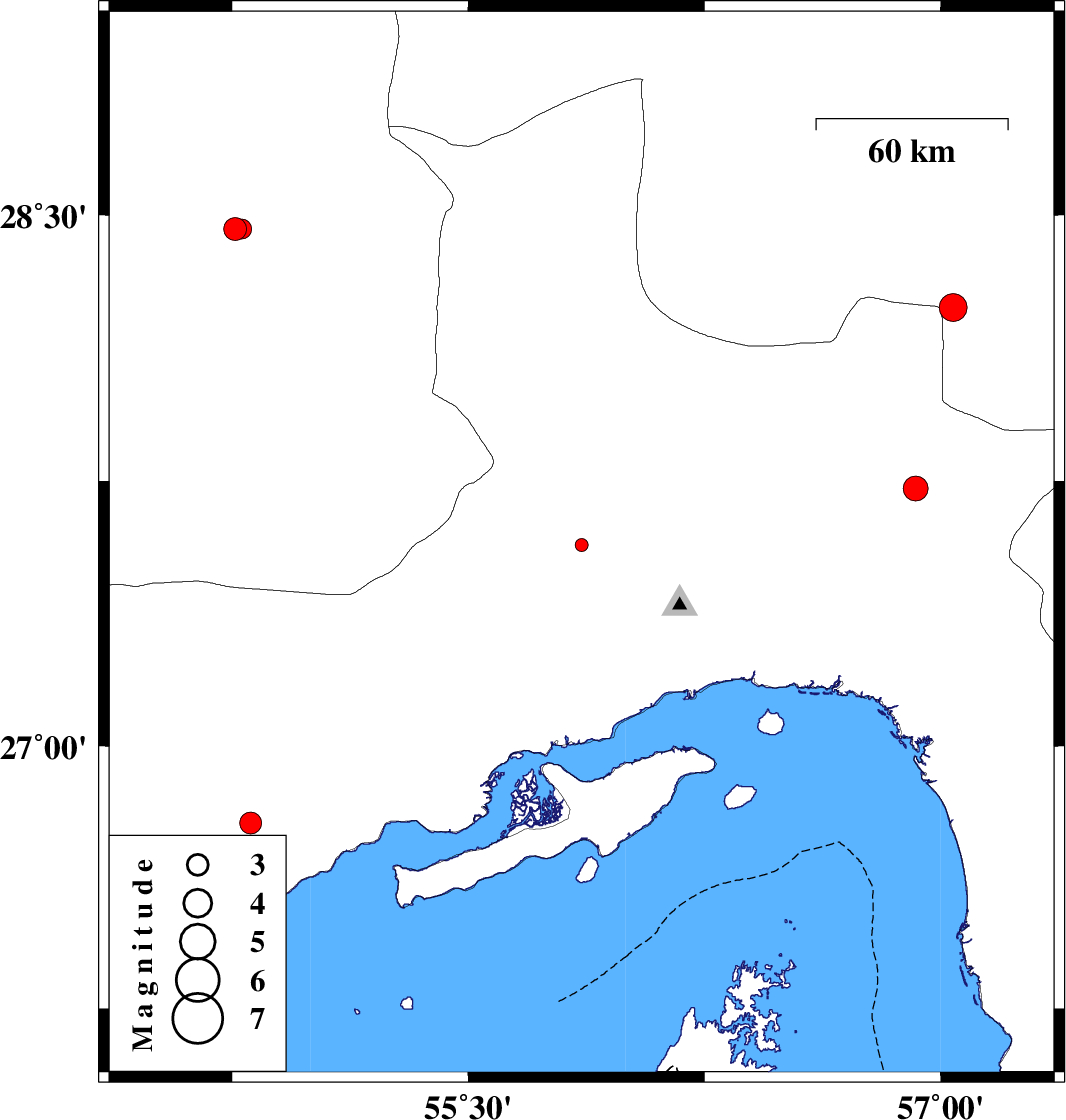 | 2012/06/07 | 07:45:02.3 | 12:15:02.3 | 27.57 | 55.86 | 14 | ML1.9 | Hormozgan Province, 83 km South of Hajiabad | ||