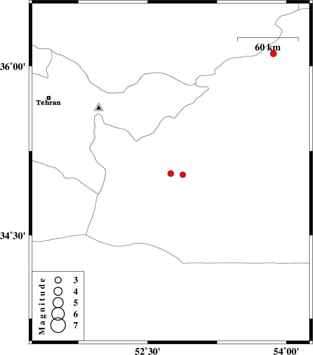 | 2012/06/03 | 17:00:57.7 | 21:30:57.7 | 35.04 | 52.88 | 25 | ML2.8 | Semnan Province, 53 km South-East of Garmsar |