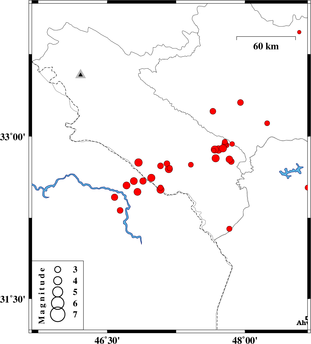 | 2012/05/19 | 17:02:42.5 | 21:32:42.5 | 32.59 | 46.79 | 14 | ML3.5 | Iraq, 45 km South-West of Dehloran | ||
