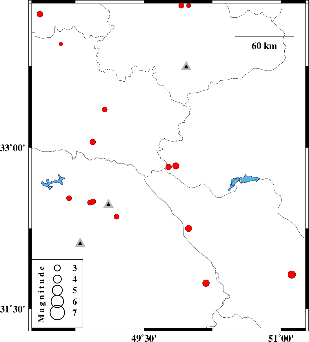 | 2012/06/08 | 15:17:55.8 | 19:47:55.8 | 32.83 | 49.85 | 14 | ML3.3 | Esfahan Province, 27 km South-West of Fereydunshahr | ||