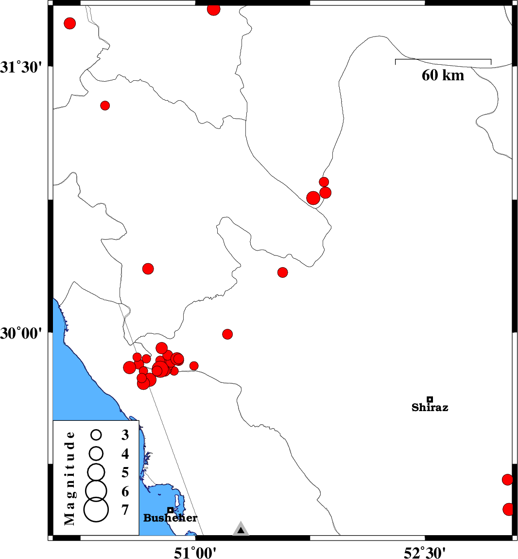 | 2012/06/04 | 19:04:19.9 | 23:34:19.9 | 29.82 | 50.63 | 46 | ML2.9 | Bushehr Province, 29 km North-East of Bandar-e genaveh | ||