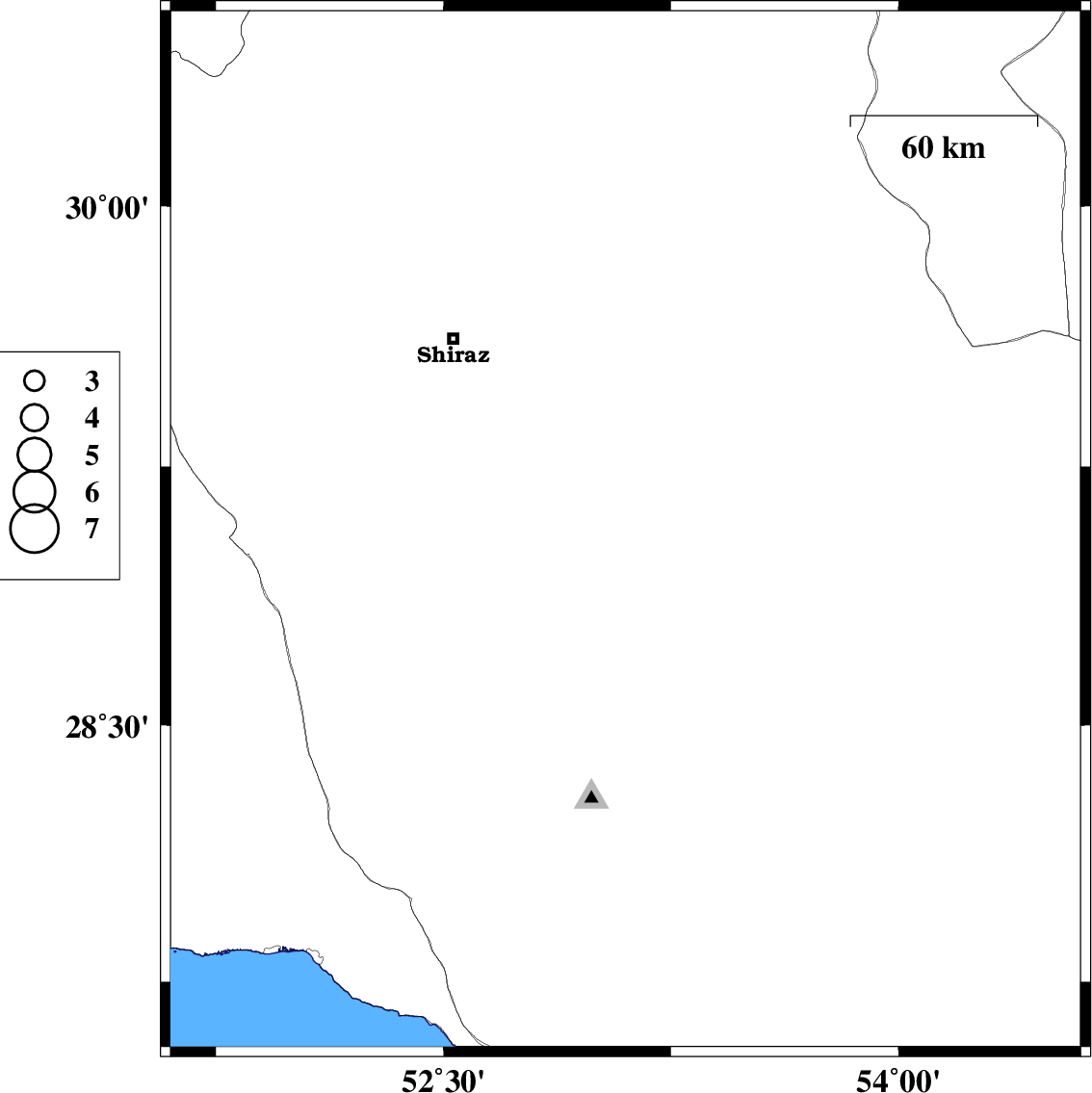 | 2012/06/12 | 22:53:50.2 | 03:23:50.2 | 29.06 | 53.1 | 15 | ML3.6 | Fars Province, 54 km North-West of Fasa |